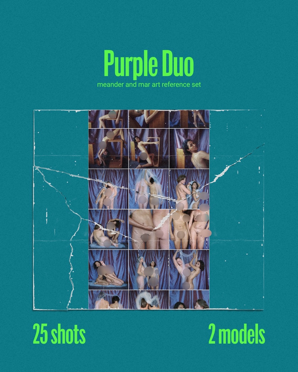 Purple Duo Reference set on analog film. 25 clear and detailed shots of two life drawing models meeting each other. Purple silk fabric, wood and skin. Mar art model and I have made an intimate series of photographs for you to draw from and purchase for artistic reasons only. This is the whole set, so the purple duo and violeta together. Half of the set is duo and half of the set is Mar art model by @Meandering.images